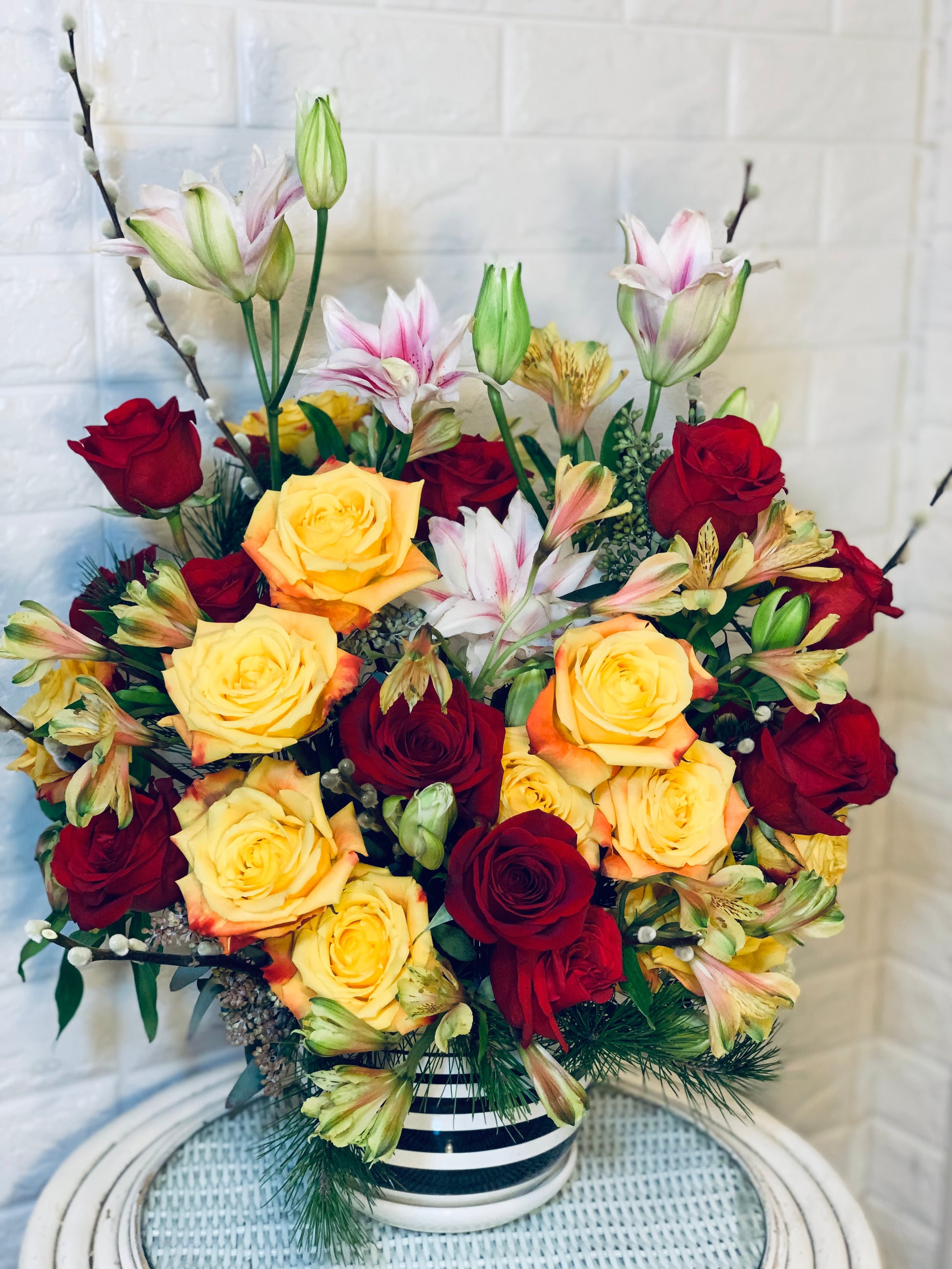 Smiling contains high quality red Roses, yellow Roses, Alstroemerias, Lilies, and greeneries. It will remind that person about you.
