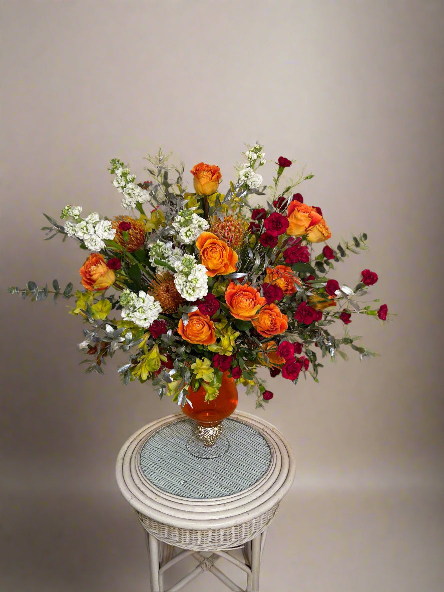 "Sym A2" is created from high quality Roses, Spandragons, Carnations, and other flowers.