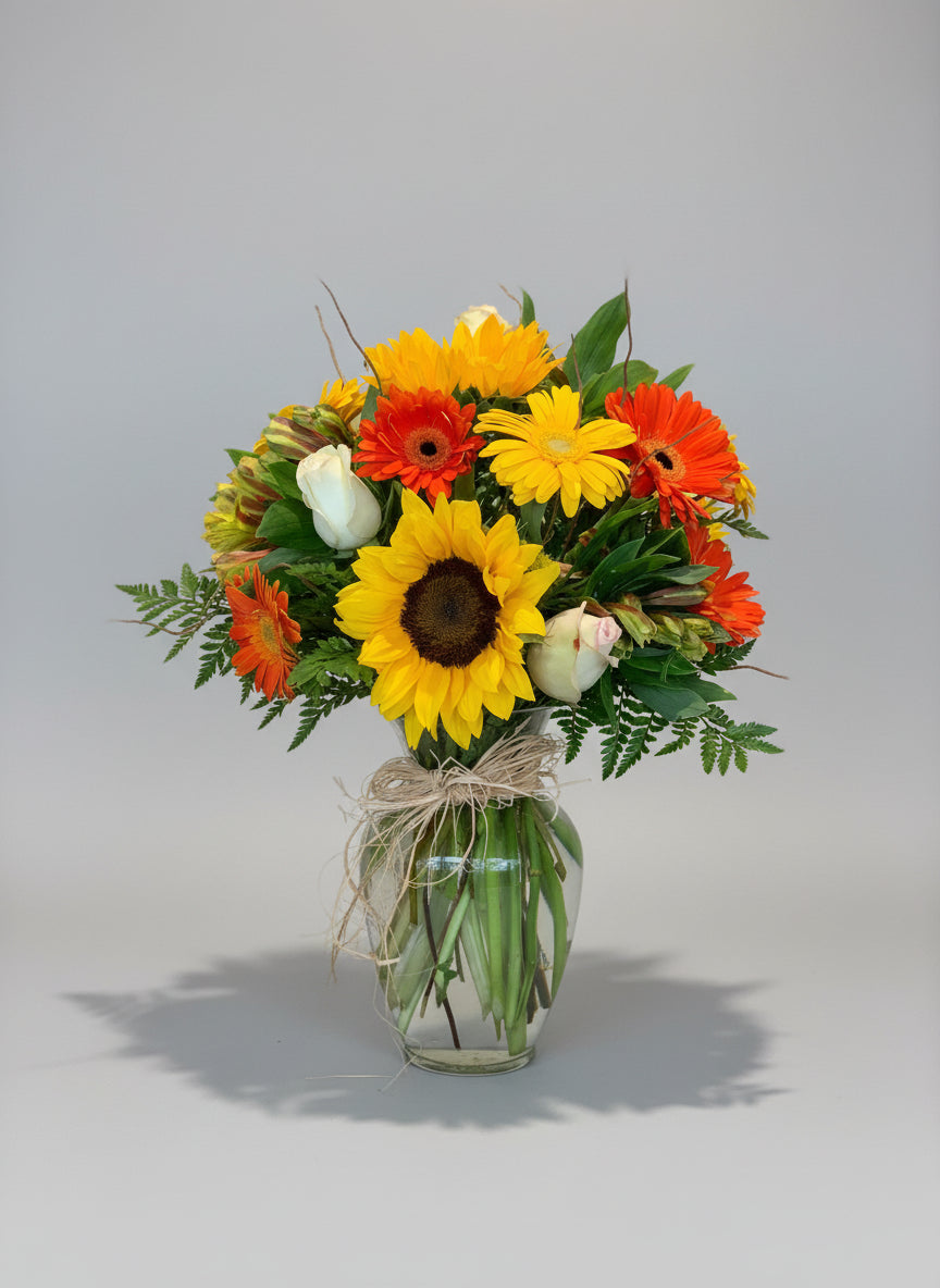 The "Radiance of the Sun" arrangement is crafted from premium Roses, Sunflowers, Gerberas, Astromelias, and assorted greenery. It serves as an exquisite gift for any occasion, expressing your affection and thoughtfulness.