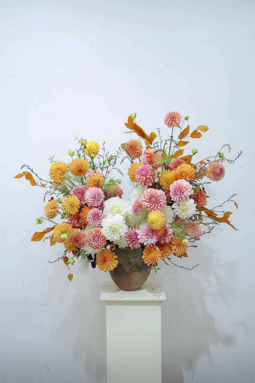 The vibrant colors of fall shine through with stunning high-quality dahlias and lush greenery, making "The Beauty of Fall" the perfect gift for any occasion this season. They are a thoughtful way to express love, care, or gratitude.